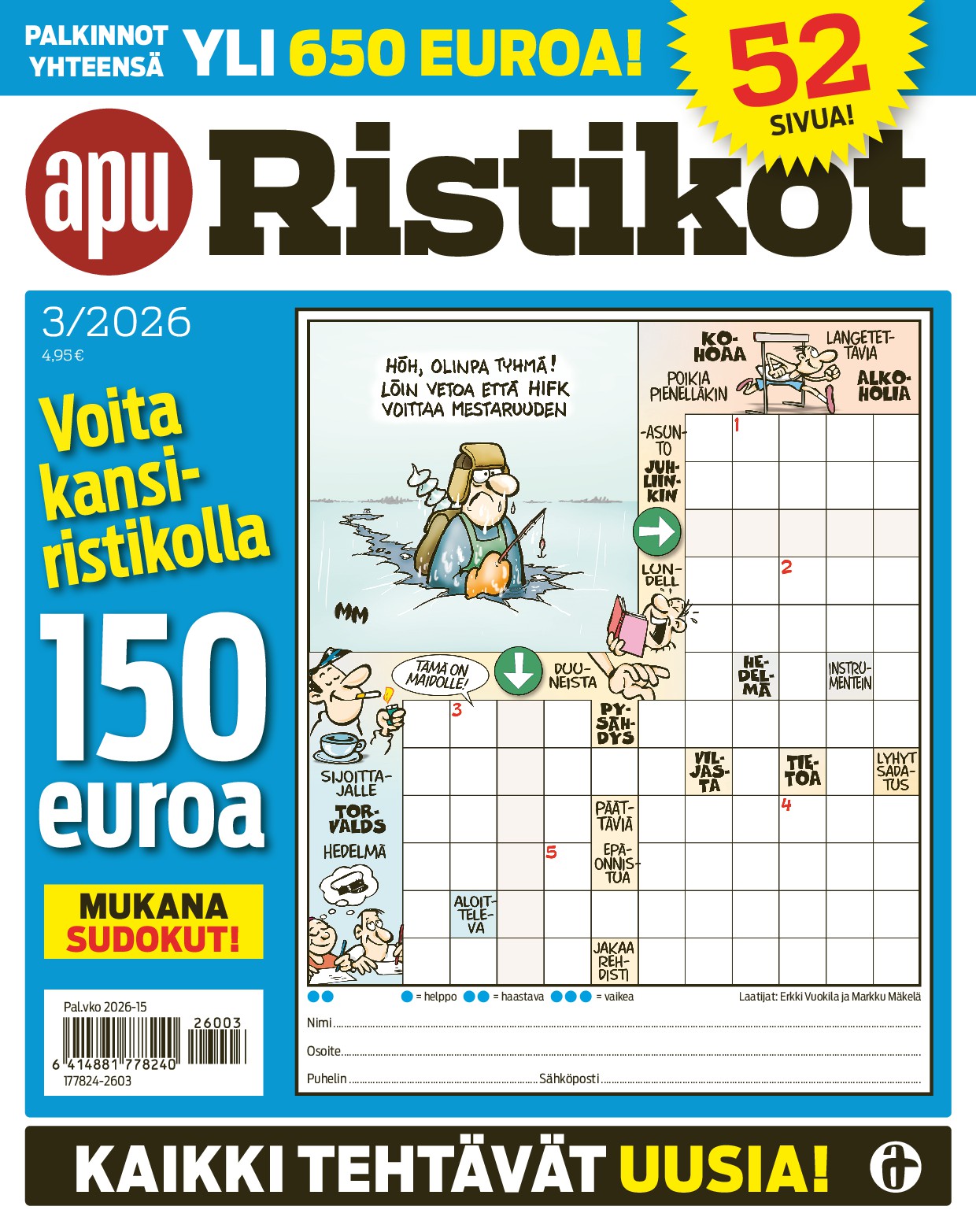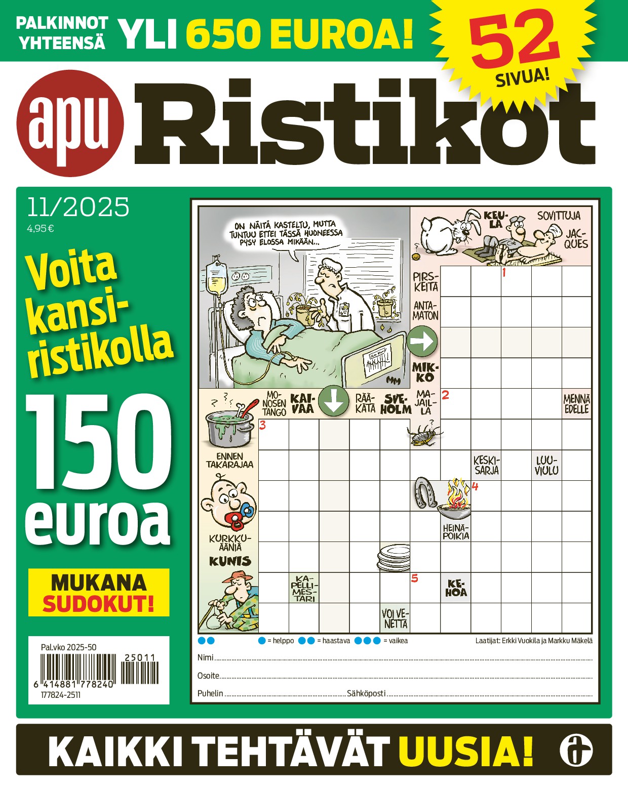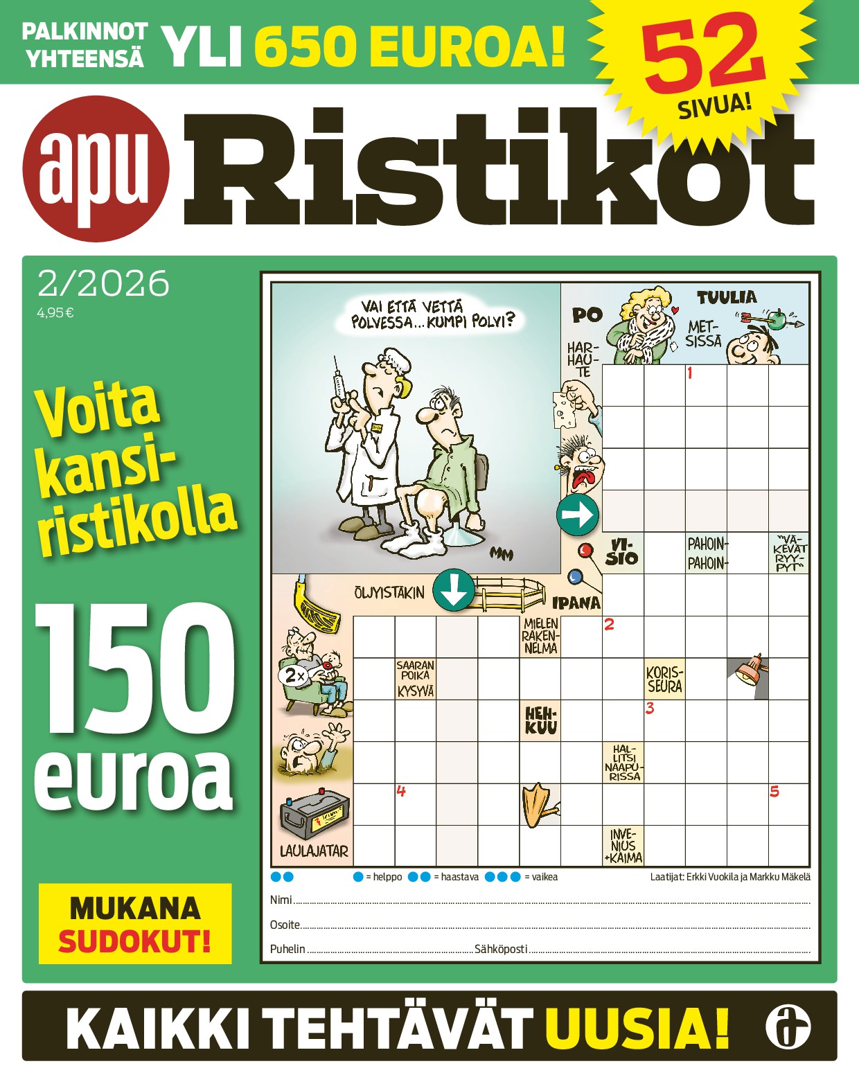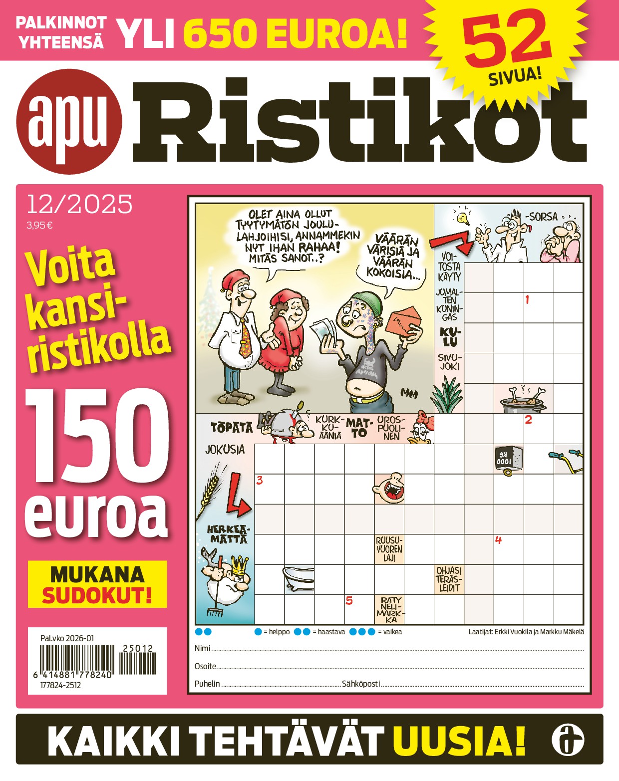 Tilaa ApuRistikot Lehtikuningas.fi-sivustolta ja saat jokaisessa numerossa laajan valikoiman erilaisia tehtäviä: kuvaristikoita, kryptoja, piilosanoja, anagrammeja ja kuva-arvoituksia. Tehtävät ovat kokeneiden laatijoiden käsialaa, joten voit luottaa siihen, että jokainen ristikko on huolella laadittu ja selkeä ratkoa. Lisäksi lehdessä on aina mukana palkintotehtäviä, joiden yhteisarvo voi nousta yli 700 euroon – samalla kun treenaat aivojasi, voit myös voittaa!