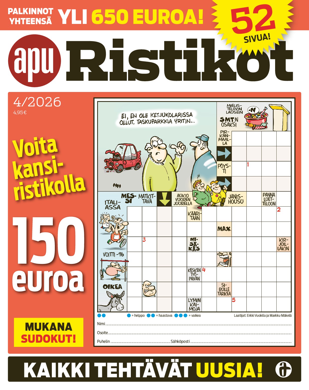 Tilaa ApuRistikot Lehtikuningas.fi-sivustolta ja saat jokaisessa numerossa laajan valikoiman erilaisia tehtäviä: kuvaristikoita, kryptoja, piilosanoja, anagrammeja ja kuva-arvoituksia. Tehtävät ovat kokeneiden laatijoiden käsialaa, joten voit luottaa siihen, että jokainen ristikko on huolella laadittu ja selkeä ratkoa. Lisäksi lehdessä on aina mukana palkintotehtäviä, joiden yhteisarvo voi nousta yli 700 euroon – samalla kun treenaat aivojasi, voit myös voittaa!