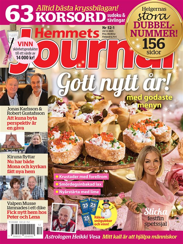 Hemmets Journal on Ruotsin rakastetuimpia viikkolehtiä, joka tarjoaa monipuolista ja inspiroivaa luettavaa joka viikko. Tämä perinteinen ja laadukas ruotsinkielinen lehti ilmestyy 52 kertaa vuodessa ja sopii täydellisesti kaikille, jotka arvostavat koskettavia tarinoita, hyödyllisiä vinkkejä ja viihdyttävää sisältöä.