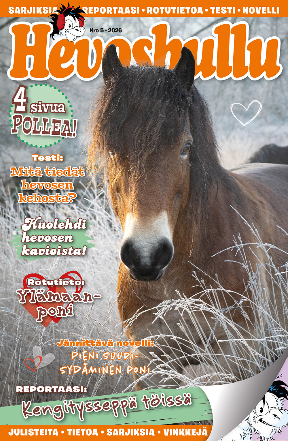 Hevoshullu-lehden lukuisat ihanat kuvat hevosista saavat jokaisen heppahullun silmät kiiltämään! Jokaisessa numerossa on mukana myös pientä puuhaa sekä jännittäviä ja hauskoja sarjakuvia, kuten kaikkien rakastama Polle. Joidenkin numeroiden mukana tulee myös hevosjulisteita!