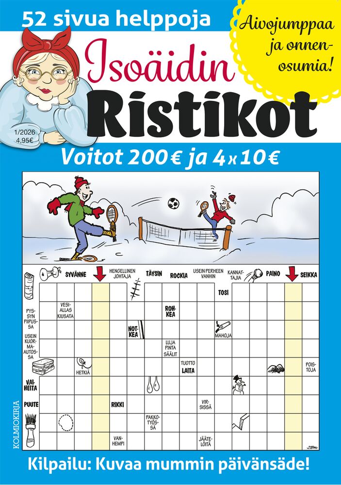 Jos etsit sopivan helppoa mutta silti hauskaa ja viihdyttävää ristikkolehteä, Isoäidin Ristikot on juuri oikea valinta. Tästä lehdestä löydät laadukkaita kuvaristikoita ja kepeää huumoria, joka tekee ratkonnasta rentouttavaa ja mukavaa. Mukana on myös suosittuja erikoistehtäviä, kuten tavuristikoita, joiden ansiosta tekeminen ei lopu kesken.