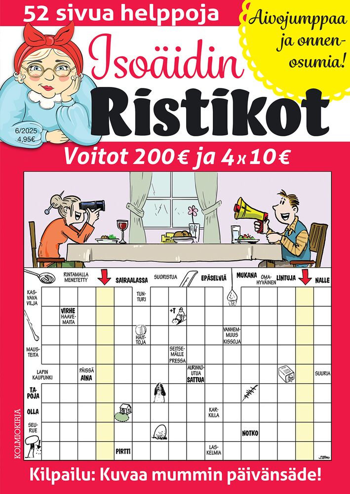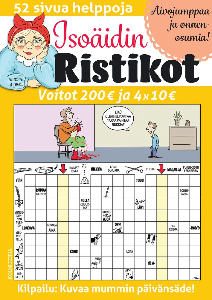Jos etsit sopivan helppoa mutta silti hauskaa ja viihdyttävää ristikkolehteä, Isoäidin Ristikot on juuri oikea valinta. Tästä lehdestä löydät laadukkaita kuvaristikoita ja kepeää huumoria, joka tekee ratkonnasta rentouttavaa ja mukavaa. Mukana on myös suosittuja erikoistehtäviä, kuten tavuristikoita, joiden ansiosta tekeminen ei lopu kesken.