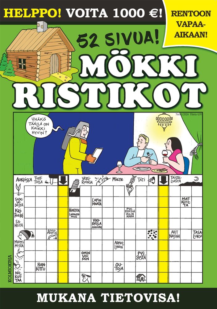 Mökkiristikot tarjoaa ennen kaikkea suosittuja kuvaristikoita, mutta mukana on myös sanahakuja, kryptoja, tavuristikoita sekä sokkeloita ja väritystehtäviä, joiden parissa viihtyvät myös perheen pienimmät. Jokaisessa numerossa on lisäksi hauska bonuskilpailu, josta voi voittaa jopa 1000 euroa puhtaana käteen!