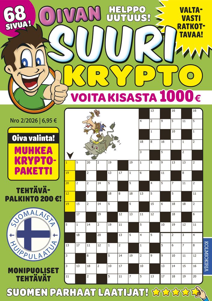 Oivan Suuri Krypto on uutuus, joka tarjoaa iloa ja haastetta kaikille sanaristikoiden ystäville. Tämä suomenkielinen lehti sisältää 68 sivua sopivan helppoja, mutta silti ajatuksia herättäviä kryptoja, joiden sanasto on selkeää ja laadukasta. Tehtävien laatijoina toimivat kokeneet ammattilaiset, jotka takaavat nautinnollisen ratkontakokemuksen sekä aloittelijoille että kokeneemmille harrastajille.