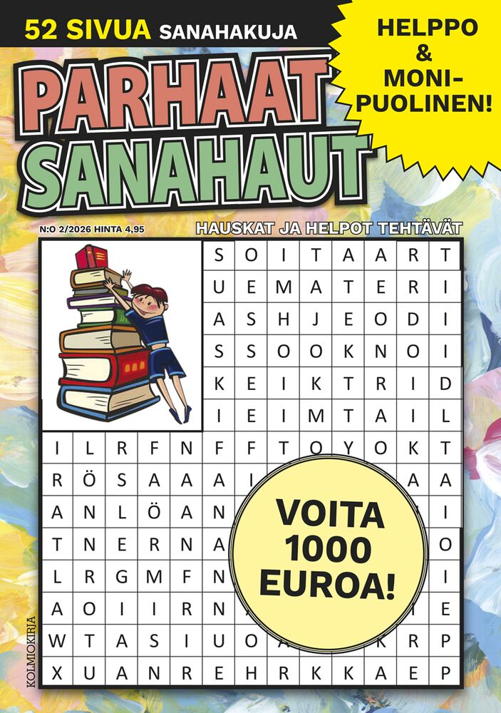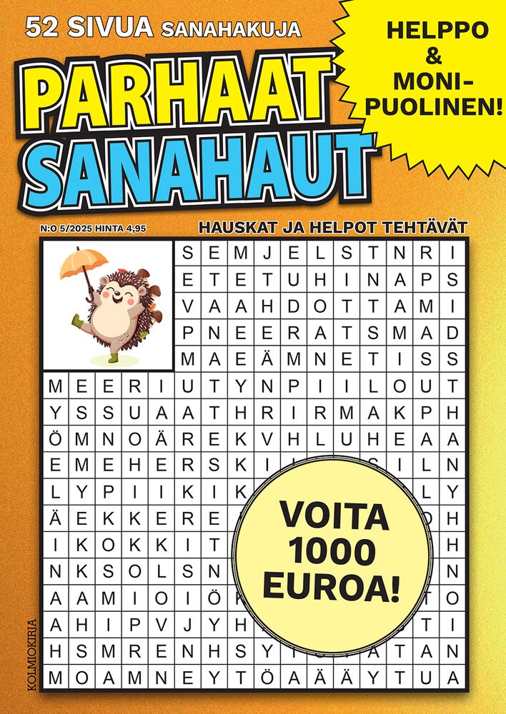 Parhaat Sanahaut on paksu ja edullinen uutuus sanahakujen ystäville. Lehti sisältää tuhdin paketin laadukkaita sanahakutehtäviä suomalaisten huippulaatijoiden tuotannosta.52-sivuinen tehtäväkokonaisuus ilahduttaa niin kokeneita ratkojia kuin aivan aloittelijoitakin. Sanahaut ovat selkeitä ja helppoja, ja kaikki oikeat ratkaisut löytyvät lehden loppuosasta. Parhaat sanahaut tarjoaa rentouttavaa ratkottavaa ja oivalluksen iloa. Hyppää mukaan sanahakujen maailmaan ja nauti olostasi. Mukana bonuskilpailu, josta voi voittaa 1000 euroa!