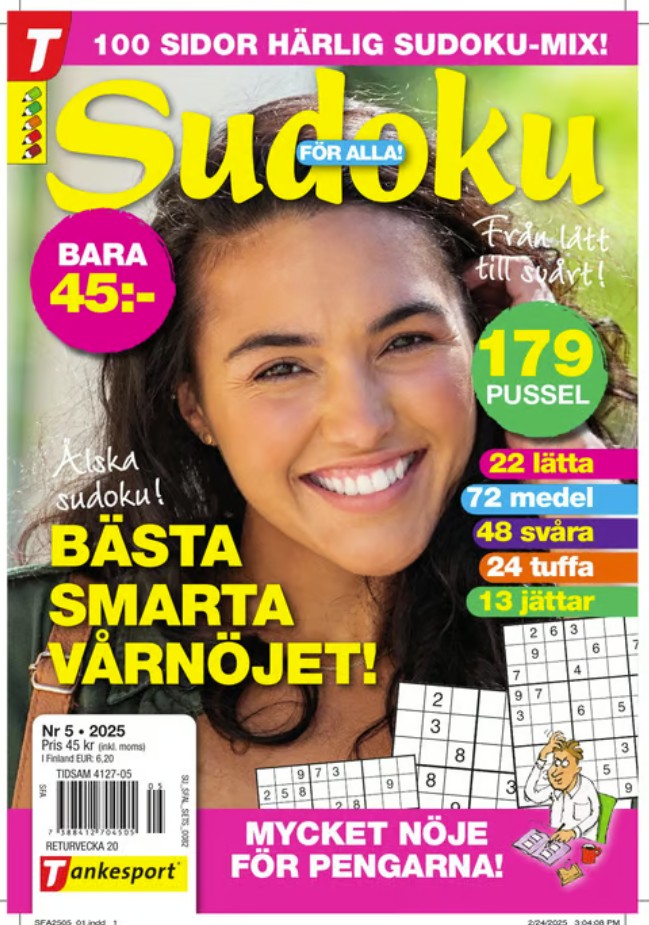 Sudoku för alla on ruotsinkielinen lehti, joka tarjoaa aivoja kutkuttavaa tekemistä kaikille numeropulmien ystäville. Tämä taskukokoinen julkaisu sisältää peräti 179 sudokutehtävää jokaisessa numerossa ja sopii erinomaisesti niin aloittelijoille kuin kokeneillekin ratkojille. Lehti ilmestyy 13 kertaa vuodessa, ja jokaisessa 100-sivuisessa numerossa on huolella laadittuja tehtäviä viidessä eri vaikeustasossa. Tilaa Sudoku för alla helposti osoitteesta Lehtikuningas.fi ja vie sudokuharrastuksesi uudelle tasolle!