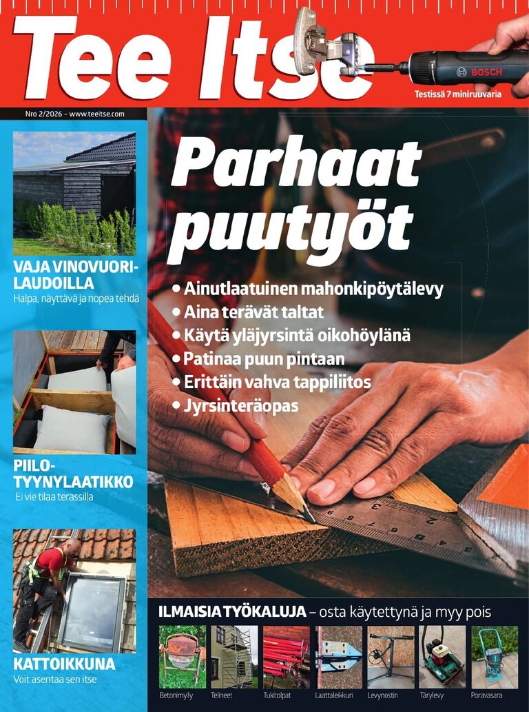 Tee Itse on mahtava lukupaketti kaikille, joiden mielenkiinnonkohteisiin kuuluvat rakentaminen, remontointi ja nikkarointi sekä itse tekeminen. Tee Itse tarjoaa käytännönläheisiä ja selkeitä ohjeita oman kodin kunnostamiseen. Tilaa apua nikkarointiin osoitteesta Lehtikuningas.fi!